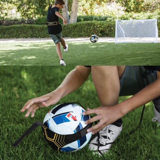 Practice Outdoors or Indoors.Soccer practice is usually outdoors, but even if it’s raining, snowing, or you simply don’t have a backyard, you can still use our solo soccer trainer inside your home. The length of the elastic bungee of our soccer trainer is adjustable, letting you shorten it if you want to practice in a tight space indoors.