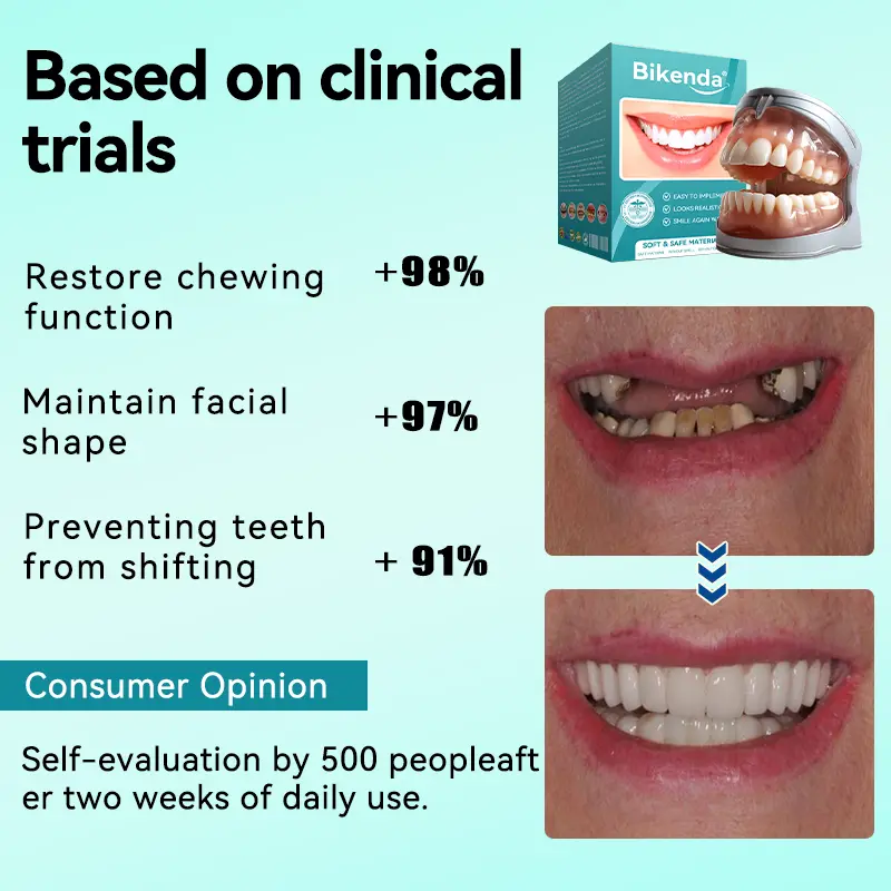 Instant Perfect Smile: Transform your smile instantly with the . Experience the satisfaction of achieving a flawless. customized fit right away. Our innovative denture set eliminates the discomfort of poorly fitting dentures. offering you a snug and natural feel that makes your dentures feel like a true part of your mouth. Say goodbye to sore spots and irritation as Denture Set provides immediate relief. allowing you to enjoy your smile with newfound confidence and comfort. Enjoy a seamless transition to a better-fitting. more comfortable denture experience without delay.