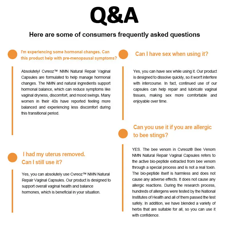 Bee venom enzymes have potent anti-inflammatory effects, reducing vaginal inflammation within 3-5 days.ย NMN, as a direct precursor to NAD, promotes repair and regeneration of vaginal epithelial cells, improving tissue health. Menopausal women often experience vaginal dryness due to poor blood circulation in vaginal tissues.ย By increasing NAD+ levels, NMN enhances blood supply to vaginal tissues, rapidly increasing lubrication.
