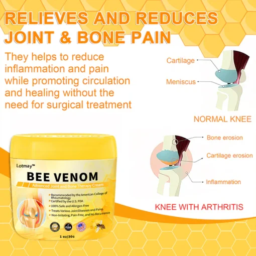 When applied to the skin, bee venom can interact with receptors involved in pain perception and inflammation. This interaction can lead to modulation of inflammatory pathways, potentially reducing the release of pro-inflammatory molecules that contribute to swelling of joints and bones.