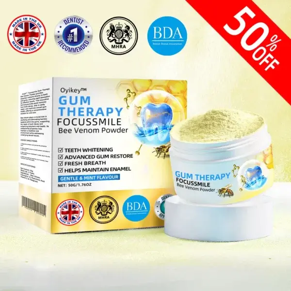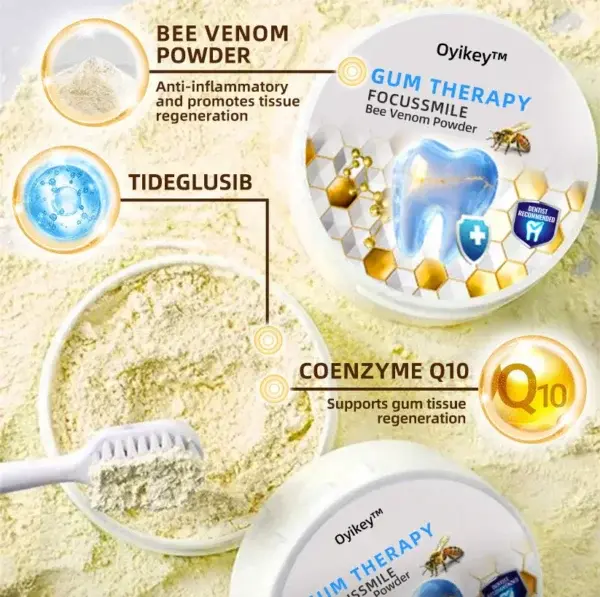 Thanks to a groundbreaking gum repair method developed by researchers at theΒ University of Sydney, ππ²π’π€ππ²β’ Focussmile Bee Venom Treatment Oral PowderΒ incorporatesΒ Tideglusib, which activates gum stem cells to stimulate tissue regeneration.