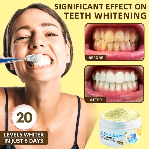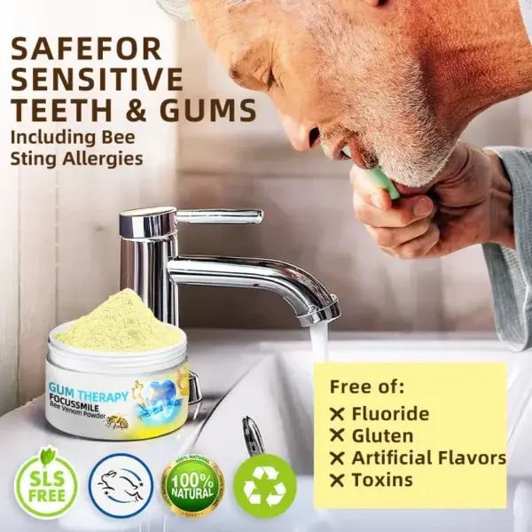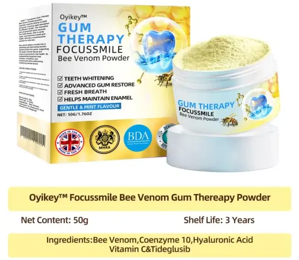 ππ²π’π€ππ²β’ Focussmile Bee Venom Treatment Oral Powder offers more than immediate reliefβit providesΒ long-term protectionΒ for your gums. TheΒ antioxidantΒ compounds inΒ bee venomΒ neutralize free radicals andΒ reduce oxidative damage to oral tissues, promoting strong and resilient gums.Β Combining clinically proven ingredients with natural care solutions, this powder ensuring aΒ lifetimeΒ ofΒ healthy teeth and gums.
