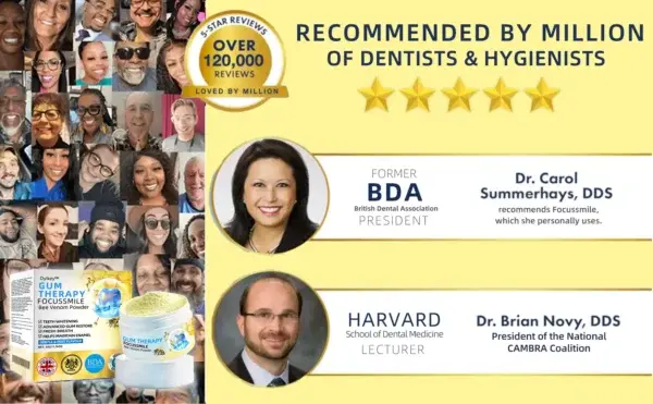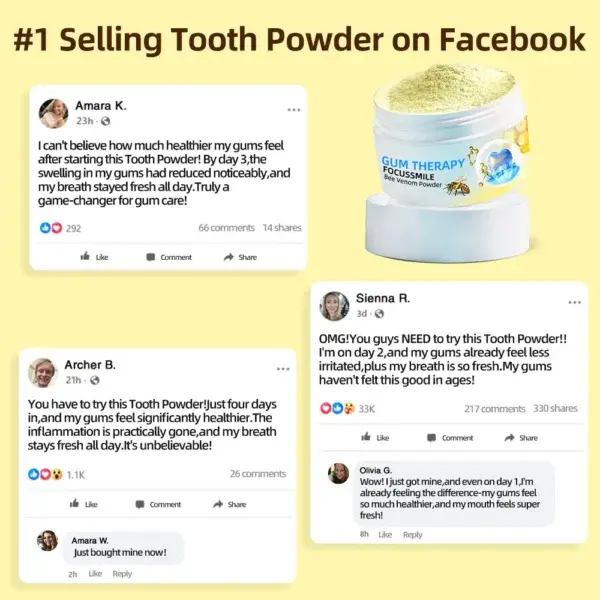 βI started noticing that myΒ teethΒ felt slightlyΒ loose, which really worried me. A friend recommended ππ²π’π€ππ²β’ Focussmile Bee Venom Treatment Oral Powder, and Iβve been using it for theΒ past two weeks. The results have been fantasticβmyΒ gumsΒ have started toΒ return to their natural position, and Iβve seen aΒ noticeable reduction in gum bleeding and swelling.Β My mouth feels clean, fresh, and rejuvenated, with a significant improvement in breath freshness. On top of that, myΒ teethΒ feel muchΒ strongerΒ and I finally haveΒ fresh breath, giving me confidence in their stability. This product has been an effective and natural solution for managing my periodontitis.βΒ β Carrie Bowen, 56