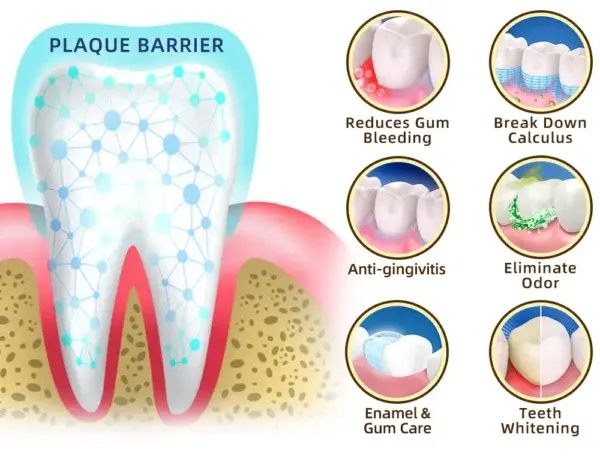 This advanced formula effectivelyΒ eliminatesΒ 99.99% of harmful bacteria, freshens breath, removes plaque and tartar, treats gingivitis and periodontitis, alleviates toothaches, prevents bleeding gums, restores enamel, stimulates gum tissue formation, and supports gums regeneration.