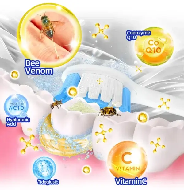 Bee Venom:Β Known for its antibacterial andΒ anti-inflammatory benefits, bee venom works to combatΒ oral bacteria and inflammation, whileΒ promoting tissue regeneration. This powerful ingredient aids in gum health, helping to soothe irritation, heal damaged tissues, and support overall dental wellness.