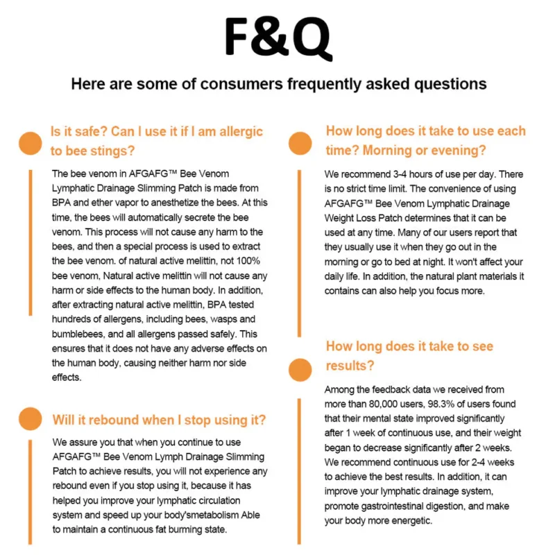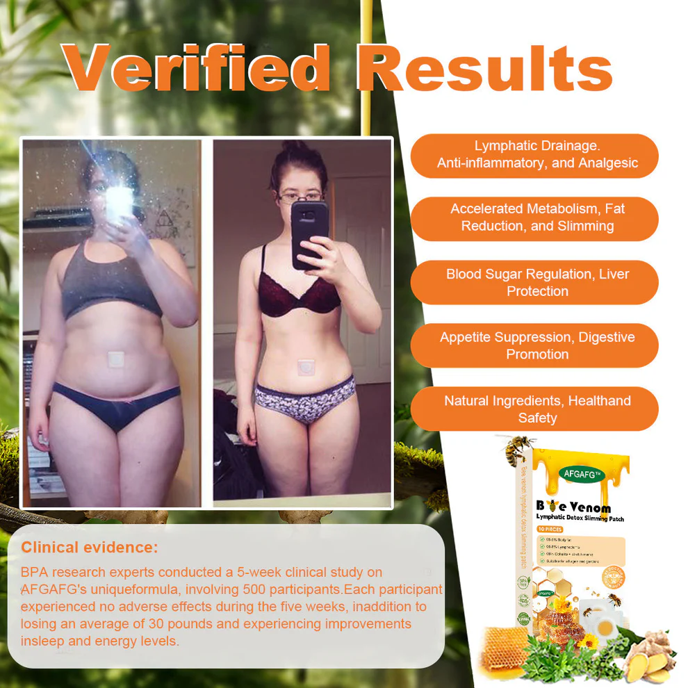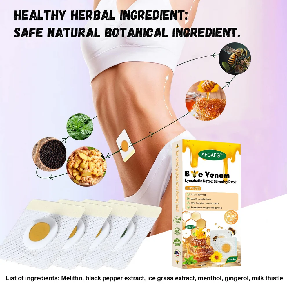 The digestive and lymphatic systems are vital pathways for detoxification in the body. Thatβs why we developed AFGAFGβ’ BeeΒ Lymphatic Drainage Slimming Patches, which contain bee venom, plantain extract, as well as extracts from four natural herbs. Highly active ingredients are concentrated and enclosed in the silky wrap of the slimming patch. During application, close contact between the abdomen and the silky wrap of natural herbs stimulates intestinal peristalsis, facilitating faster and more effective penetration into the lymphatic system. By cleansing the lymph nodes to remove waste and supporting liver detoxification and toxin absorption, it improves metabolism, leading to effortless fat loss and reduction of inflammation, promoting a healthier body.