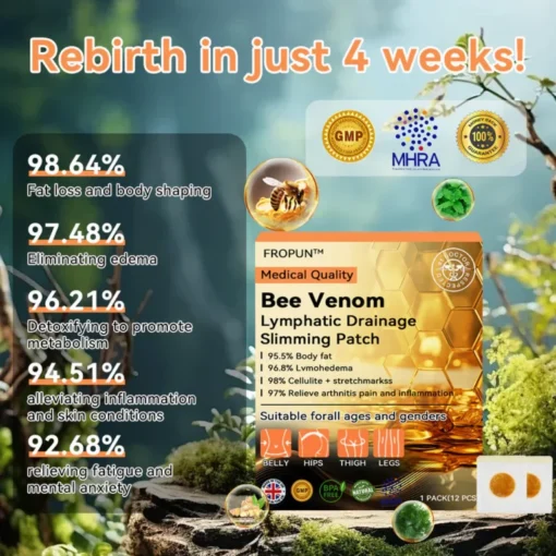 The digestive system and lymphatic system are crucial detox pathways in the body. Thatβs why weβve developedΒ ππΉπΆπ·πΌπ΅β’ π©ππ π½ππππ π³ππππππππ π«πππππππ πΊπππππππ π·ππππΒ ,which contains bee venom and ice plant extract, along with extracts from four natural herbs. The highly active ingredients are concentrated and encapsulated in the silk wrap of the slimming patch. During use, the close contact between the abdomen and the silk wrap of natural herbs stimulates intestinal peristalsis, allowing for faster and more effective penetration into the lymphatic system. By clearing lymph nodes to expel waste and assisting liver detoxification and toxin absorption, it enhances metabolism, achieving effortless fat loss and inflammation reduction, and promoting a healthier body.