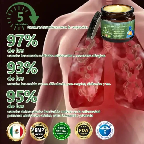π³πππππβ’ π΄ππππππ πͺππππ π³πππ πΉπππππ πͺππππ actΓΊa liberando extracto de gordolobo en el sistema respiratorio superior cuando se aplica. Esto ayuda a despejar las vΓas respiratorias estimulando y diluyendo la mucosidad de la trΓ‘quea y los pulmones, facilitando la expulsiΓ³n de flemas y residuos pulmonares en 2 horas. AdemΓ‘s, la Crema Limpiadora Pulmonar ayuda a regular el sistema inmunitario y a reducir las reacciones alΓ©rgicas mediante la terapia de desensibilizaciΓ³n, tratando eficazmente las alergias respiratorias y el asma. El equipo de investigaciΓ³n del Dr. Lonnie ha desarrollado una fΓ³rmula ΓΊnica que combina pΓ©ptidos de colΓ‘geno recombinantes y quercetina para promover la regeneraciΓ³n de los tejidos pulmonares, de las vΓas respiratorias y alveolares, dejando sus pulmones mΓ‘s sanos y limpios.