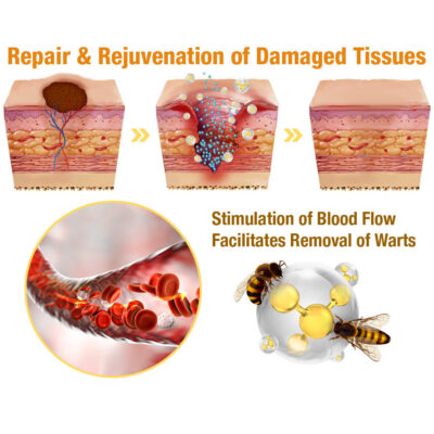 Another significant advantage of bee venom is its ability toย enhance blood circulation. It canย stimulates blood flow in the treated area, facilitating the removal of skin tags or warts byย promoting tissue regeneration and accelerating the healing process, aiding in theย repair and rejuvenation of damaged tissues.