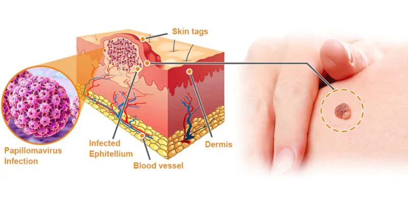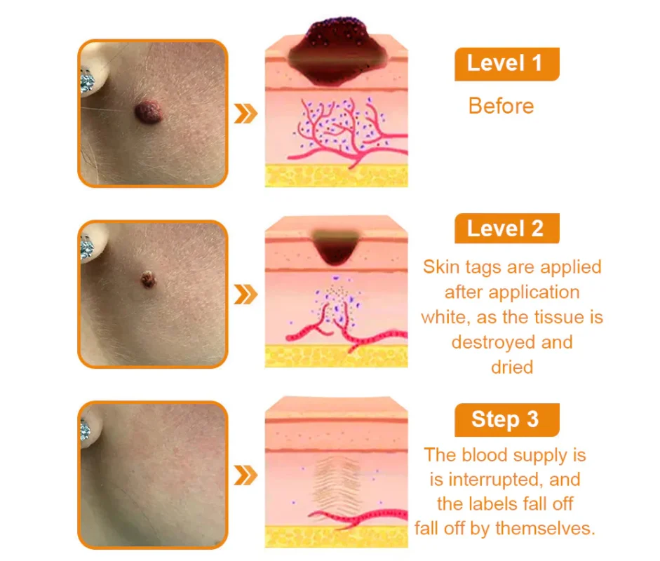 Acrochordons (Skin Tags)ย are small, non-cancerous growths that usually match your skin color. They typically appear as collections of skin tissue extending from tiny stalks. Sometimes, they can be darker and resemble raised moles. Most skin tags are between 1 and 5 millimeters long, but some can grow several centimeters large. Skin tags are common, and factors like friction, hormonal fluctuations, genetic predisposition, obesity, and insulin resistance can influence their development.