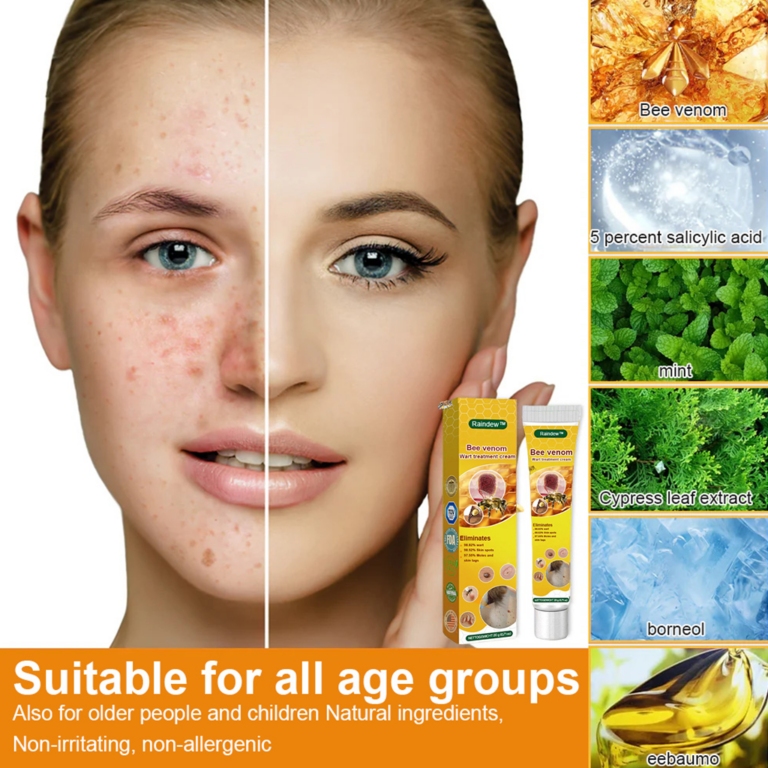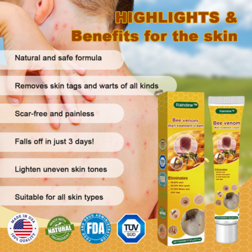 Raindewโข Bee Venom Wart Treatment Creamย offers a solution by using the powerful properties of bee venom to specifically treat various skin irregularities such as skin spots, moles, warts and blemishes.ย Enriched with active components from bee venom, this advanced formula dissolves unwanted growths and gently eliminates them.