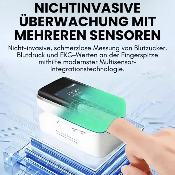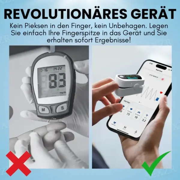 - Nicht-invasive Überwachung: Keine Fingerstiche oder Beschwerden, nur schnelle und einfache Messungen mit den Fingerspitzen.