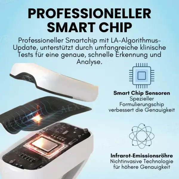 Zusätzlich zu seinem nicht-invasiven Design verfügt Glycenx™ über fortschrittliche Smart-Chip-Sensoren, die die Genauigkeit jedes Messwerts verbessern. Diese Sensoren wurden speziell entwickelt, um die Präzision des Geräts zu verbessern und sicherzustellen, dass Sie äußerst zuverlässige Glukosespiegelmessungen erhalten. Der Smart-Chip arbeitet nahtlos mit der Infrarot-Technologie zusammen, so dass das Gerät schnell und effizient Echtzeitdaten über Ihren Blutzuckerspiegel liefern kann. Das Ergebnis ist eine zuverlässige Überwachungslösung, die die Genauigkeit bietet, die Sie benötigen, um Ihren Glukosespiegel effektiv zu überwachen, und gleichzeitig den Prozess zugänglicher und schmerzfreier macht.