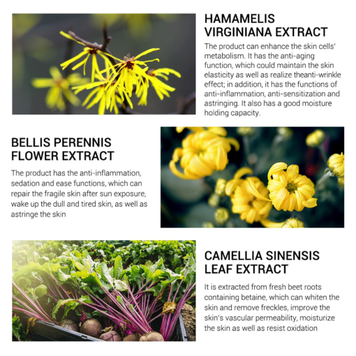 INGREDIENTS– Water, Hamamelis Virginiana Extract, Bellis Perennis Flower Extract, Beta Vulgaris Root Extract, Centella Extract, Camellia Sinensis Leaf Extract,Nicotinamide,Hyaluronic Acid,Parfum