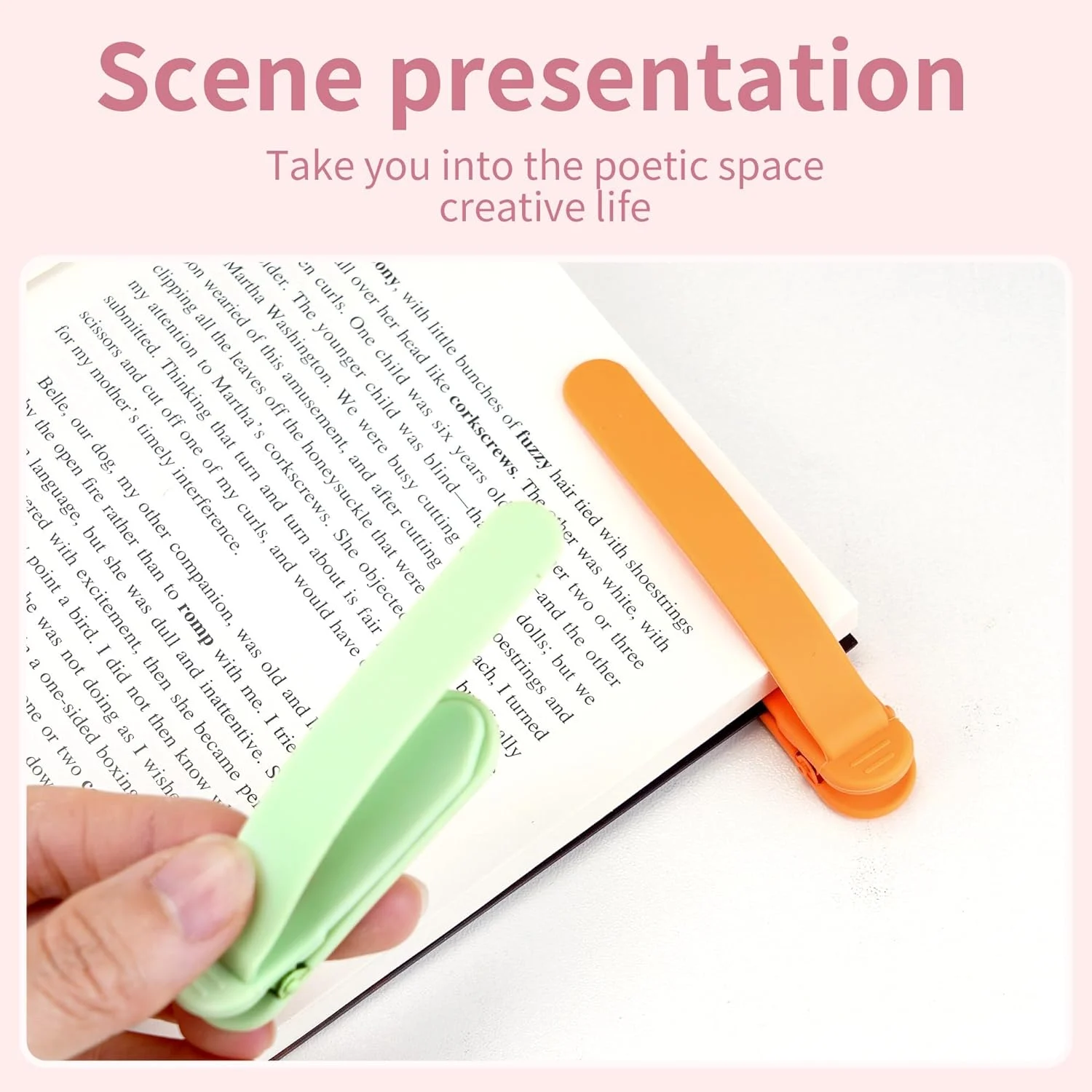 Unique patented silicone combined with clip design, protects your favorite books from damage while keeping them in place, unlike the traditional bookmarks that will slide around in your books, and can be washed directly with water for durability.