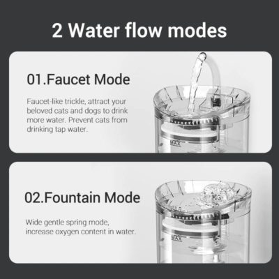 Dual Working Mode – The fountain water bowl has 2 different flow modes. Fountain mode increases water oxygen content and freshes spring water surge mode and Faucet mode attracts pets to drinks more water.