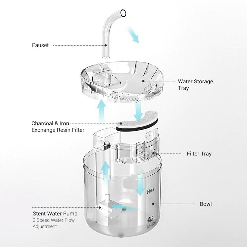 Filtered Water – It has 3 layers filter, The Sponge could catch cat’s hair and debris, the Ion exchange resin layer could soften the tap water, the third Activated Carbon Layer could remove bad taste and odor that provides fresh and clean water to pets.