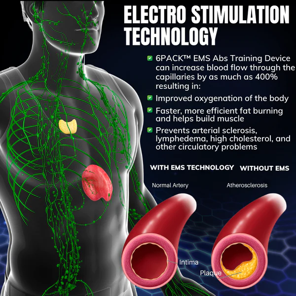 - Fat burning: The 6PACK™ EMS Abs Training Device provides various benefits, including promoting fat burning, accelerating weight loss, regulating cholesterol levels, and reducing the risk of cardiovascular disease. The device has also been shown to enhance mental focus, eliminate food cravings, stabilize blood sugar levels, and improve skin conditions.