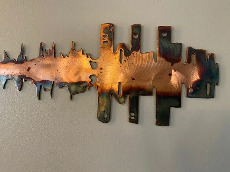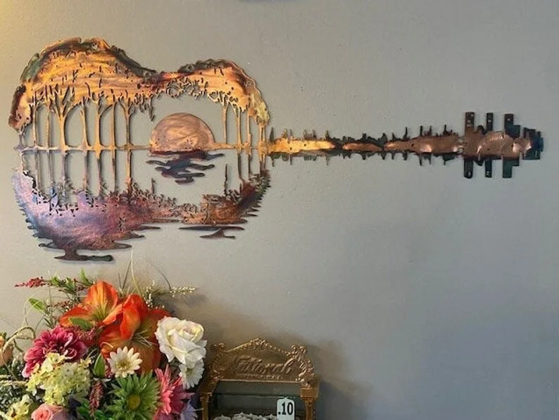 - 🎵Exquisite Workmanship: Guitar wall art cut from high-quality steel using precision plasma cutting. Hand finished with copper and torch patina and painted with a clear coat on top.