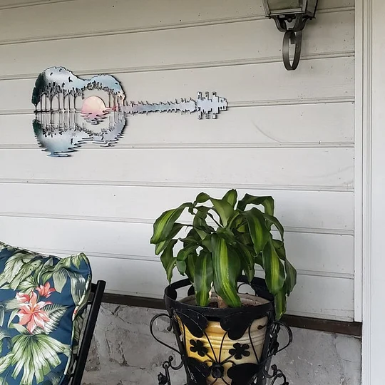 Featuring an abstract guitar shape creatively designed from trees and the setting sun, this metal guitar art is the perfect metal home decor for those who love music and nature!
