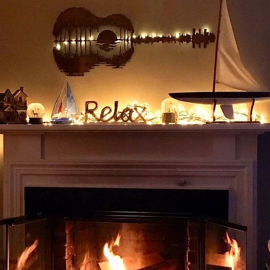 - 🎵Creative Design: This serene metal guitar sunset wall art comes in all black or hand-painted in the hues of a beautiful sunset! The sunset scene is cut into the shape of a guitar and is over a lake with trees in the background.