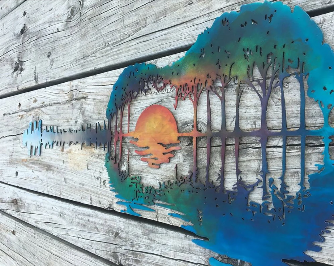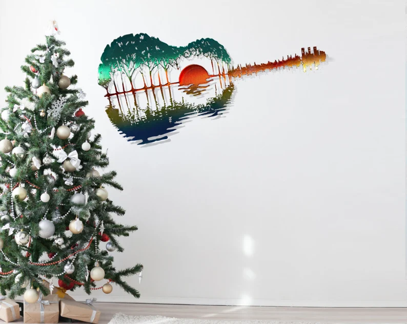 Featuring an abstract guitar shape creatively designed from trees and the setting sun, this metal guitar art is the perfect metal home decor for those who love music and nature!