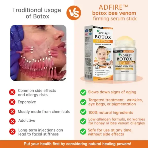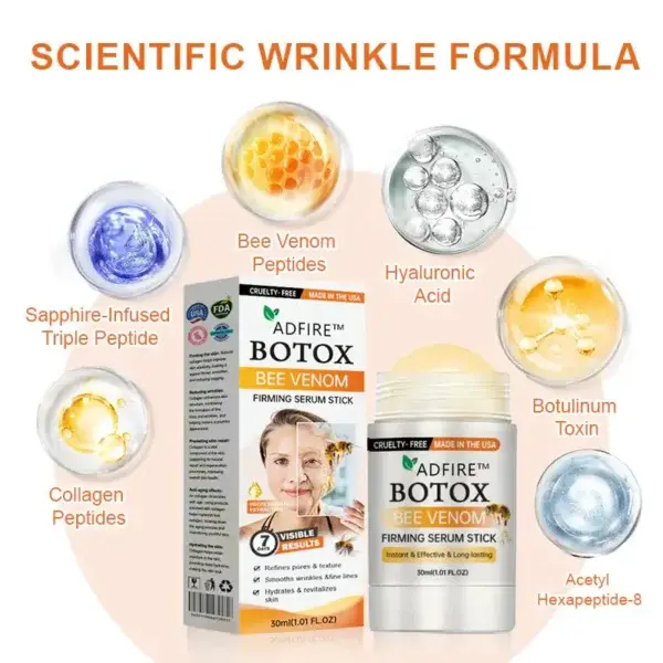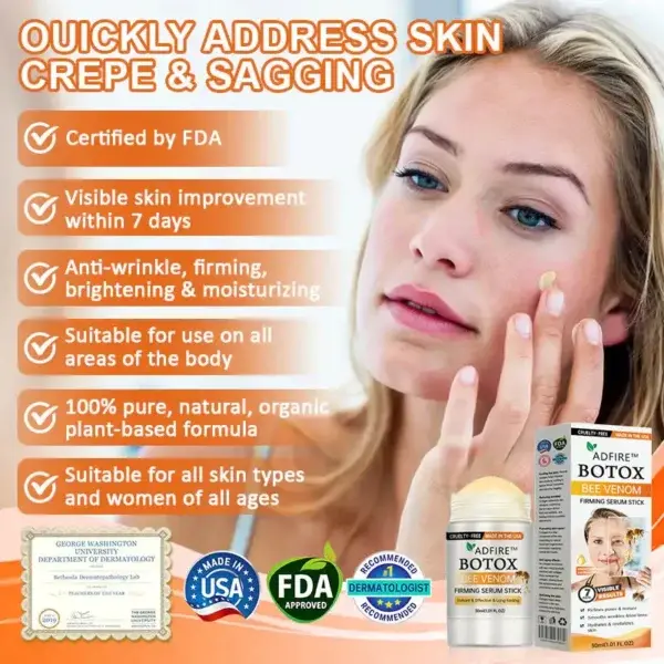 ADFIRE™ Botox Bee Venom Firming Serum Stick is a skincare product that helps smooth wrinkles, tighten loose skin, and improve skin firmness using natural ingredients like bee venom and hyaluronic acid.