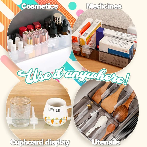 The adjustable fridge divider can be installed and removed anytime without any complicated tools needed. Simply insert the hook to the shelf grid, place your ingredients and other items, slide to adjust accordingly and done. You can even use it for organizing medicine drawers, tableware boxes, laundry storage, dishwashing holders, cosmetics and more possibilities. No worries as this clamp does not scratch or leave any damages behind your fridge surface. Made with premium plastic materials that can withstand long-lasting use without wearing-off and leaching.