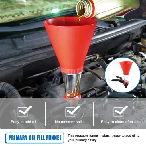 - Easy to Use: No-Spill funnel screws directly into the threads of the cap… eliminating spills, drips and having to hold the funnel in place. Wide high-flow funnel with transparent tube allows fast, easy and clean oil refilling. The funnel can be disassembled, it is very convenient to clean.