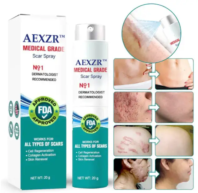 AEXZR™ Advanced Scar Spray- Made with allantoin and advanced scar Spray, our formula helps promote skin health, firmness, and elasticity to reduce the appearance of most types of scars, including surgical scars, burn scars, hypertrophic scars, and keloids. The silicone-based scar spray forms a breathable layer to increase the skin hydration, protect the scar tissue, normalize the collagen synthesis and balance the skin growth procedure,which can make your skin look smooth and even!