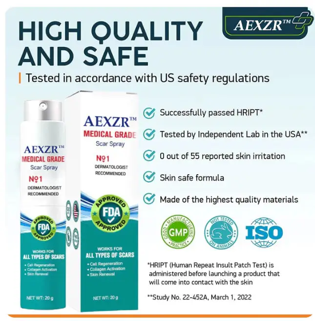 If you’re tired from so many skincare treatments for so many purposes but with none to effectively and safely cleanse the skin of the most obvious flaws, then our AEXZR™ Advanced Scar Spray 100% Advanced Scar Remove spray might be just the product you need as it will moisturize and soothe your skin by increasing hydration of the stratum corneum (the uppermost layer of the skin). This facilitates regulation of fibroblast production and also reduces collagen production. Essentially, this allows the skin to “breathe”, improving the tissue in mere days