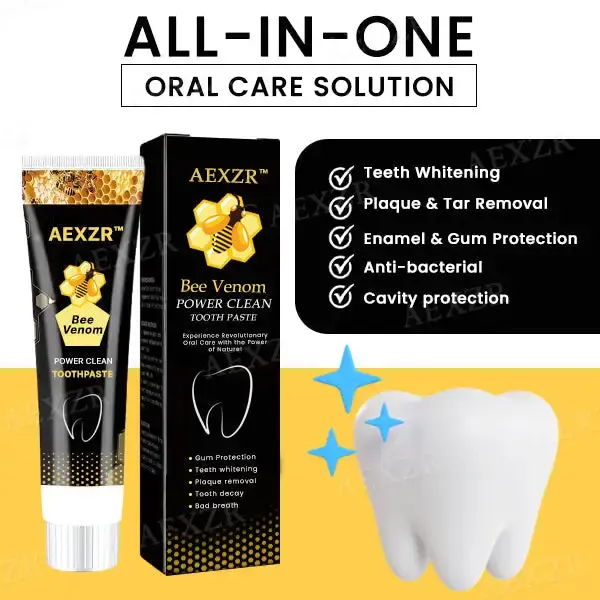AEXZR™ Bee Venom Oral Power Toothpaste uses the natural power of bee venom to fight cavities, reduce plaque, improve gum health, whiten teeth, and keep your breath fresh, all in one easy-to-use toothpaste.