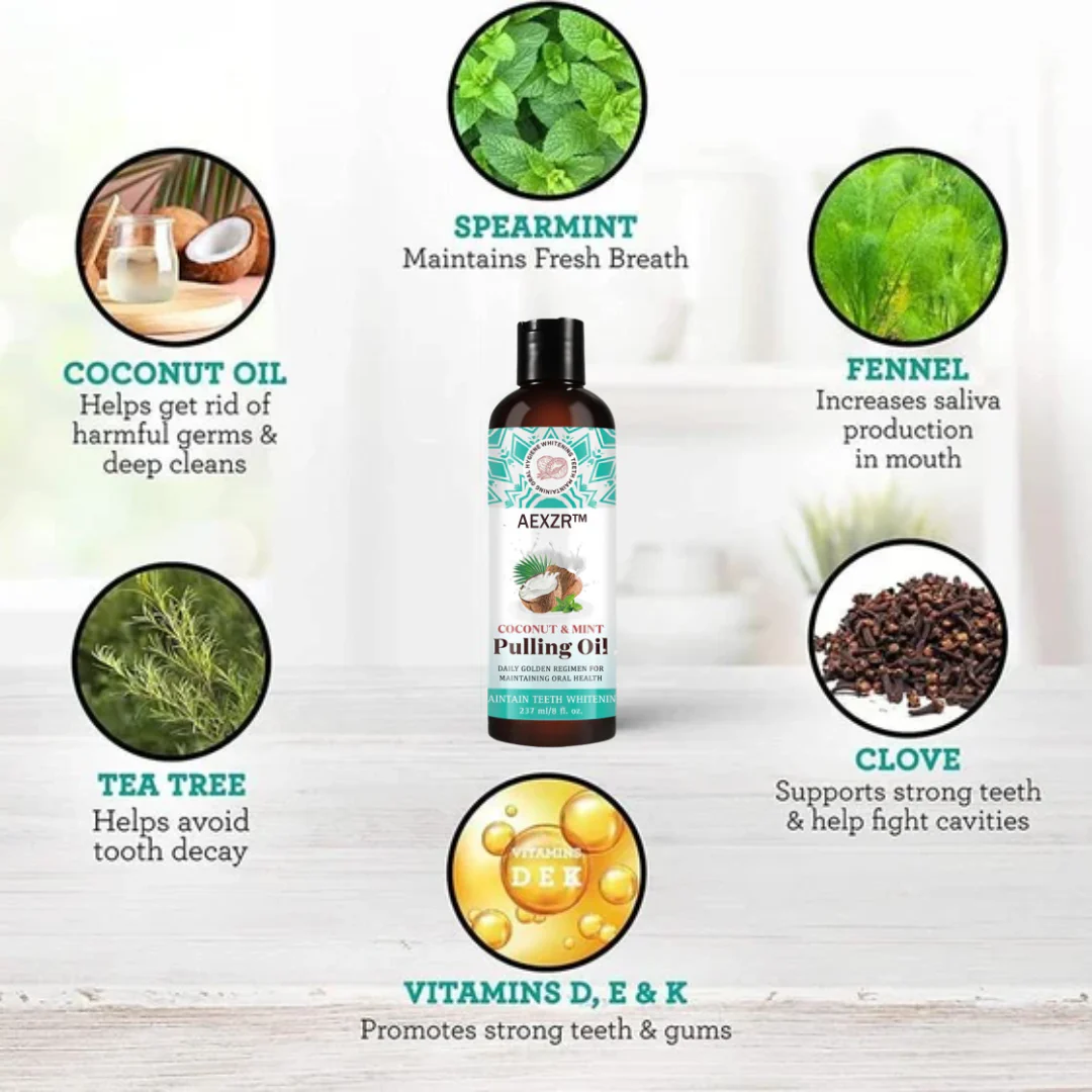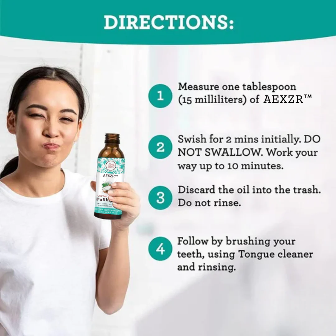 To start oil pulling take one tablespoon of the AEXZR™ Whitening Pulling Oil and swish it around your mouth for about 2-5 min (you can do up to 10min) make sure to move it between your teeth and around your gums. After swishing, spit the oil out into a trash can or tissue, as it can clog sinks or toilets, Rinse your mouth thoroughly with water and follow up with regular brushing and flossing.