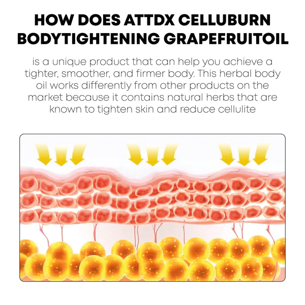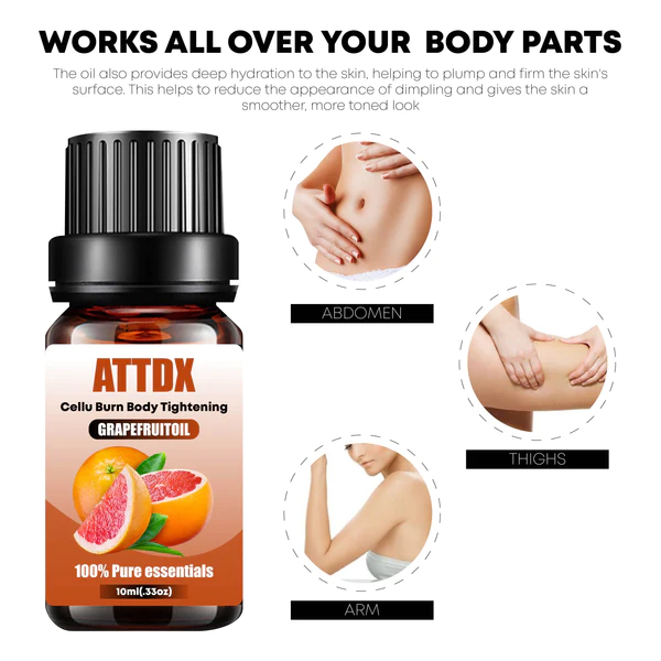 ATTDX CelluBurn BodyTightening GrapefruitOil is made with natural ingredients such as grapefruit. This powerful ingredient penetrates deeply into the skin, leaving it nourished and hydrated. When massaged into the skin, the oil can help break down fatty deposits that contribute to the appearance of cellulite, making them easier for the body to eliminate. Additionally, this oil promotes healthy skin cell growth and improves overall skin texture with regular use.