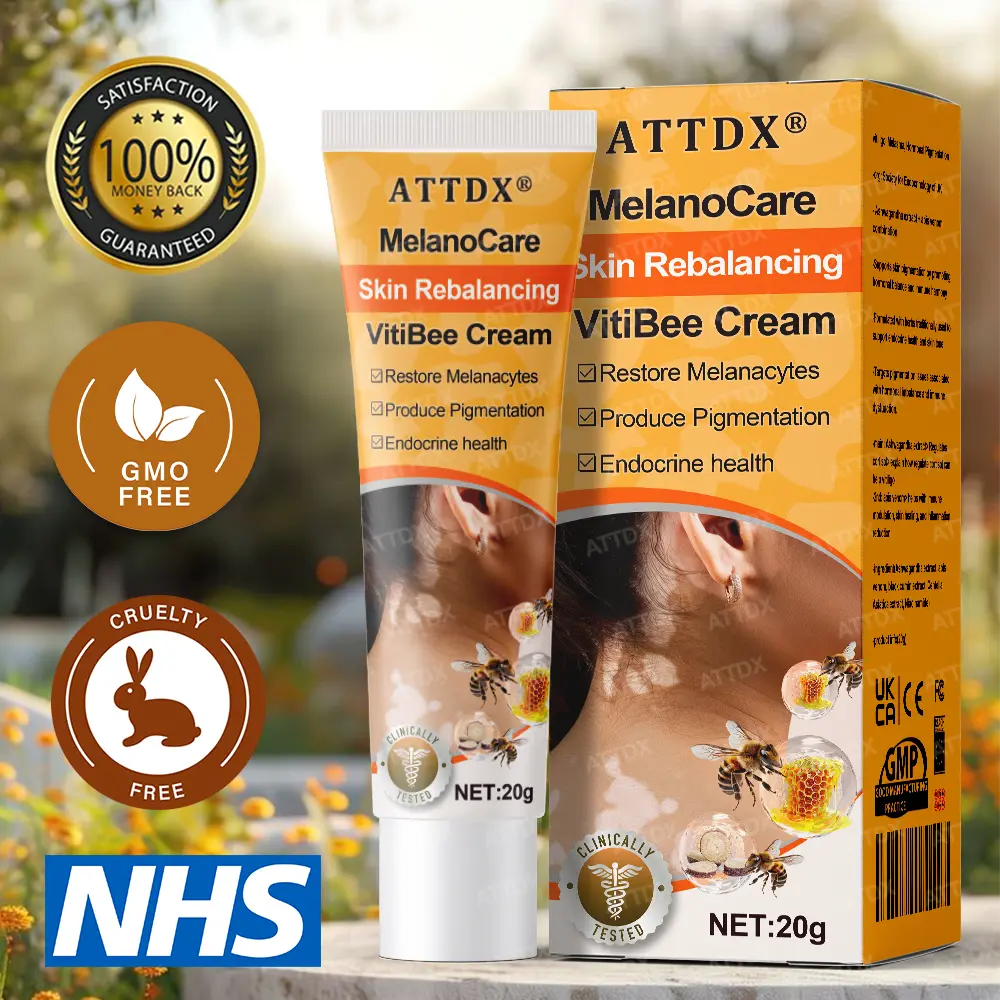 ATTDX® MelanoCare Skin Rebalancing VitiBee Cream is recommended by members of the Society for Endocrinology of UK for addressing skin pigmentation disorders such as vitiligo, melasma, and hormonal discoloration. This targeted topical formula combines traditional herbal wisdom with modern dermatological research to support pigment balance, calm inflammation, and nourish sensitive, uneven skin. It’s ideal for those navigating pigmentation changes linked to hormonal and immune irregularities.