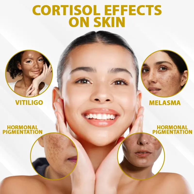 Hormonal fluctuations—particularly in cortisol, estrogen, and progesterone—can impair melanocyte function and destabilize the immune system, contributing to uneven pigmentation, flare-ups, and poor skin barrier response. In vitiligo, elevated cortisol levels can suppress the immune system in damaging ways, triggering depigmentation in patches. In melasma and hormonal pigmentation, disrupted hormone signaling encourages excess melanin production and inflammation.