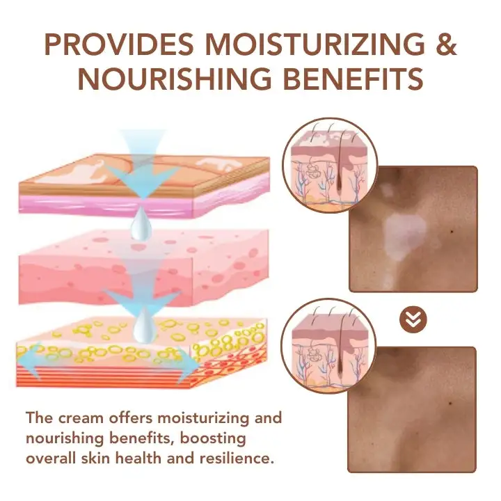 BBOJI™ Vitiligo Therapeutic Cream utilizes a targeted transdermal absorption mechanism to penetrate deep into the skin layers where melanin production occurs. Its blend of natural ingredients, including antioxidants, stimulates melanocytes, promoting pigment synthesis and distribution to the affected areas. By enhancing blood circulation, suppressing tyrosinase activity, and providing moisturizing benefits, the cream supports melanin recovery, ultimately leading to improved pigmentation and a more uniform skin tone over time.