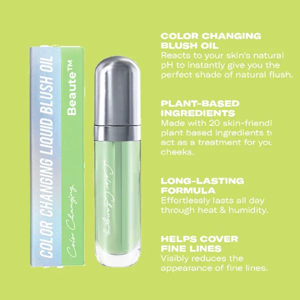 - PH color morphing formula – Made to flatter every skin tone, the Beaute™ Color Morphing Blush Oil uses thermal discoloration that gives it the ability to transform the green oil to matching blush tone once it touches your skin. This color-changing liquid blush reacts to your skin’s pH and temperature, giving you a shade of natural flush that is uniquely your own.