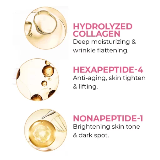 - Core ingredients: Hydrolyzed Collagen, Hexapeptide-1, Nonapeptide-1, Centella asiatica extract, Rose flower extract