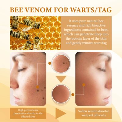 Bee venom helps to break down abnormal tissue and promote the removal of warts and skin tags, with its natural enzymes working synergistically to target and dissolve unwanted growths, enhancing the skin’s overall appearance.
