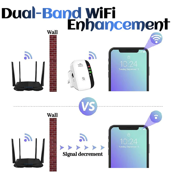 Simple Setup: Enhance your WiFi coverage easily with our plug-and-play repeater. Just plug it in, follow the simple instructions, and expand your WiFi network in no time.