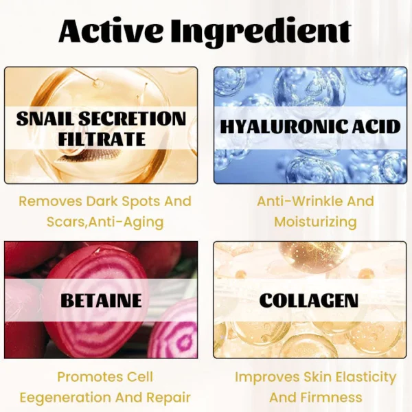 Snail secretion filtrate is a magical weapon against aging. Rich in proteins, hyaluronic acid, and growth factors, snail secretion filtrate helps promote skin cell repair and regeneration, fading spots, scars, and other issues. Additionally, its natural antioxidant components help neutralize free radicals, slowing down the skin aging process, maintaining youthful and elastic skin, and preventing wrinkles and skin sagging. It is rich in natural proteins and growth factors, 20 times more than other similar products, and does not involve animal testing.