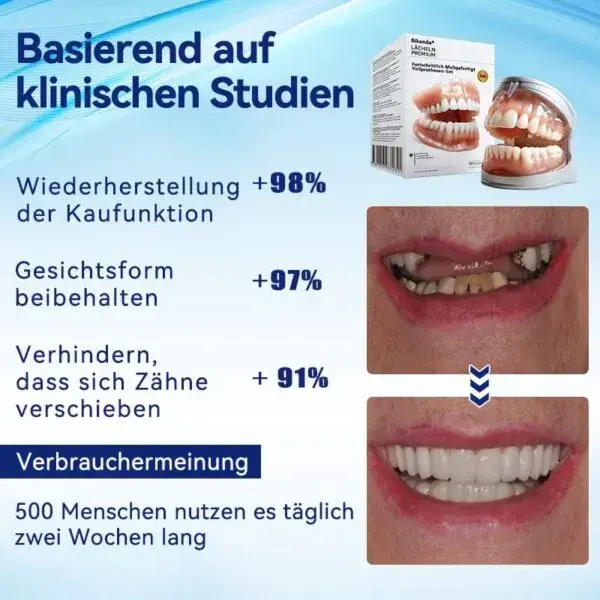 Sofort perfektes Lรคcheln: Verwandeln Sie Ihr Lรคcheln sofort mit dem . Erleben Sie sofort die Zufriedenheit einer makellosen, individuellen Passform. Unser innovatives Prothesenset beseitigt die Beschwerden schlecht sitzender Prothesen und bietet Ihnen ein angenehmes und natรผrliches Tragegefรผhl, das Ihre Prothese wie einen festen Bestandteil Ihres Mundes erscheinen lรคsst. Verabschieden Sie sich von wunden Stellen und Reizungen, denn das Prothesenset sorgt fรผr sofortige Linderung. So kรถnnen Sie Ihr Lรคcheln mit neuem Selbstvertrauen und Komfort genieรen. Genieรen Sie einen nahtlosen รbergang zu einer besser sitzenden, komfortableren Prothese ohne Verzรถgerung.