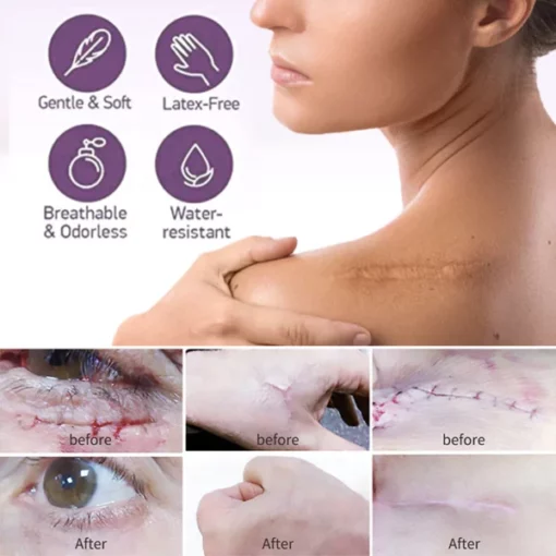 - Waterproof silicone scar stickers stay put even in the shower or during sweaty days