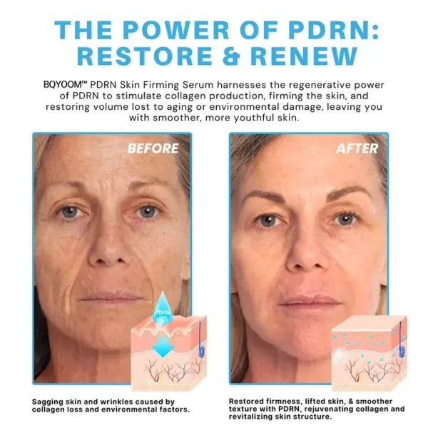 BQYOOM™ PDRN Skin Firming Serum uses the power of PDRN to stimulate collagen production and rebuild skin structure from within. This regenerative compound penetrates deeply to target wrinkles, sagging, and dark spots, enhancing skin elasticity and firmness for a smoother, more youthful appearance in just a few weeks.