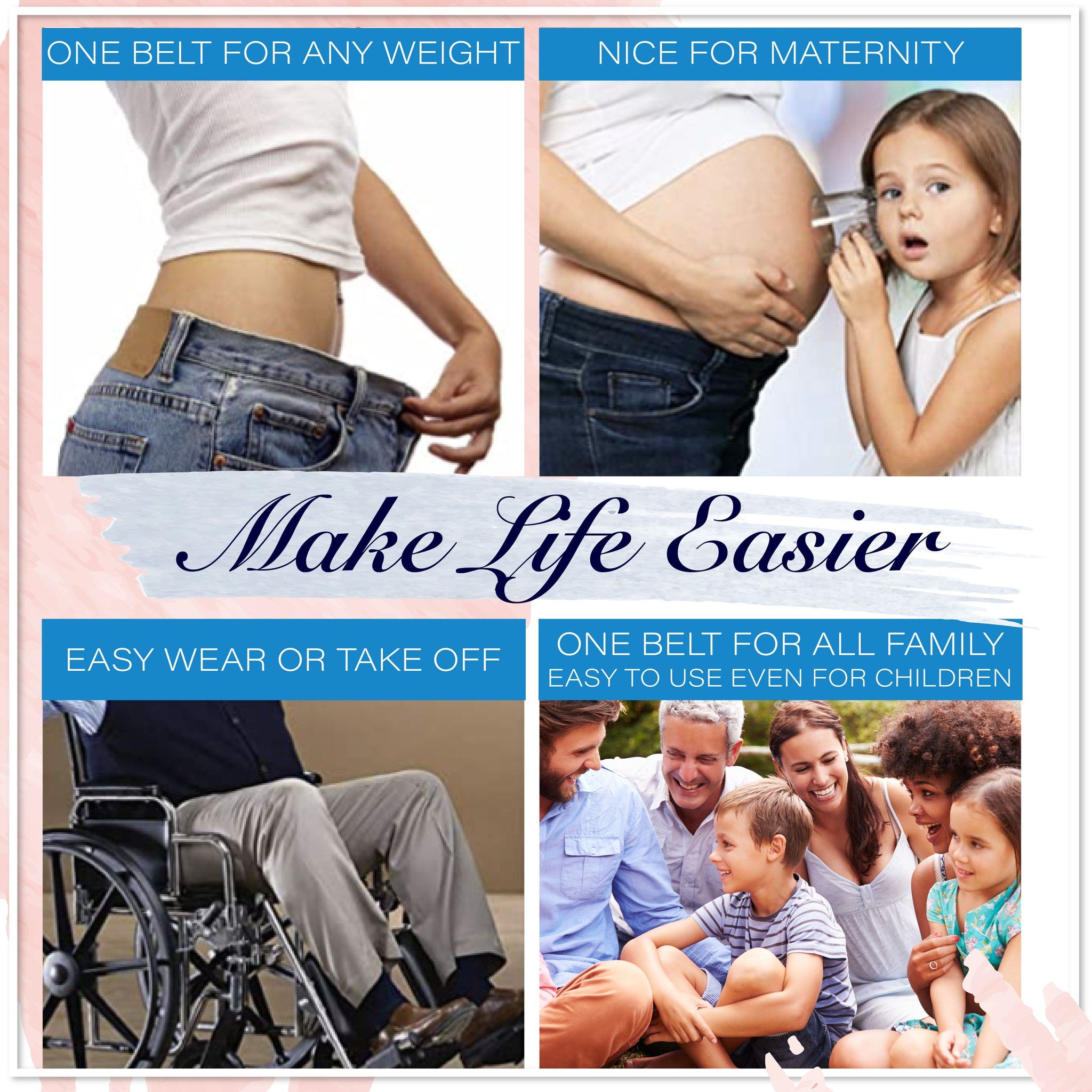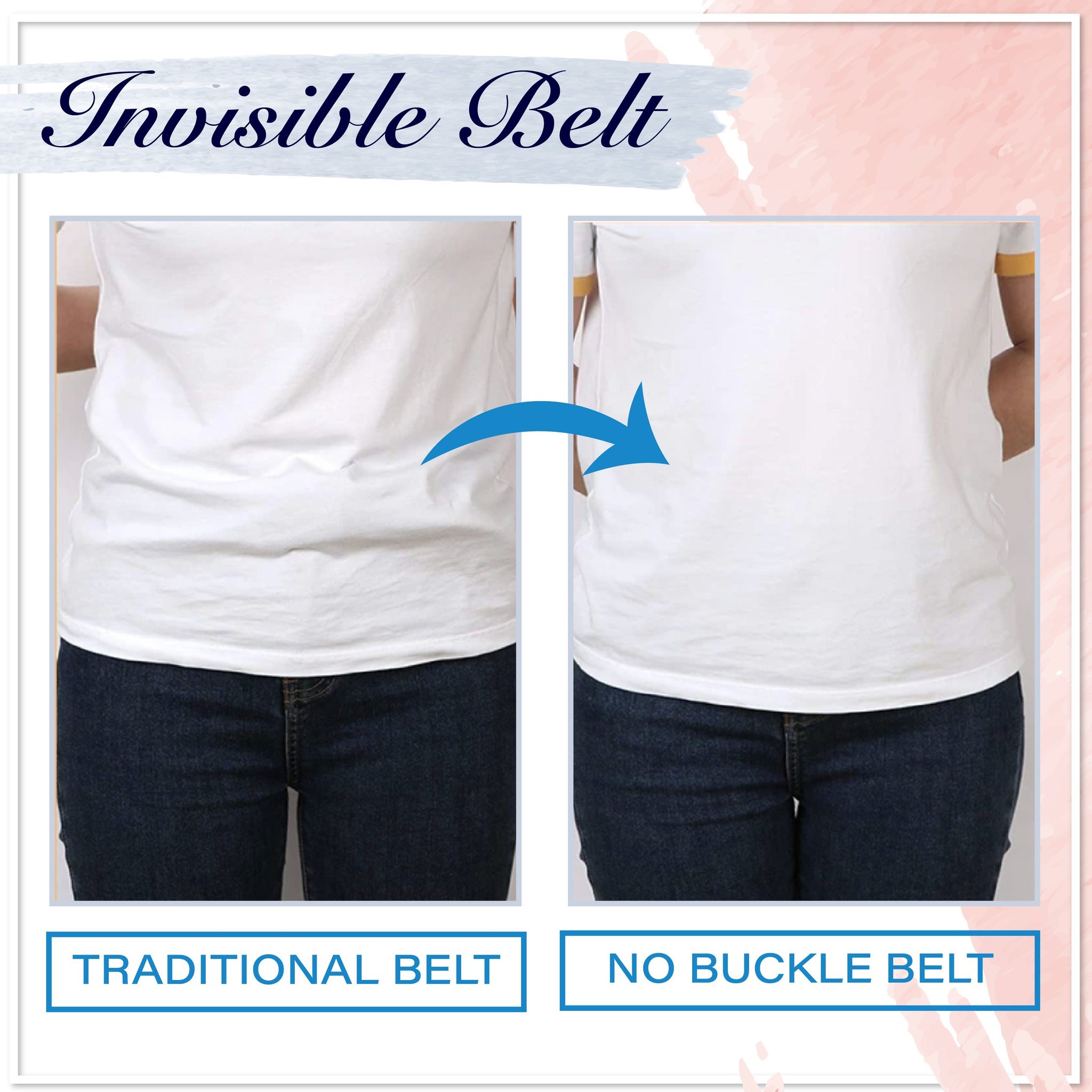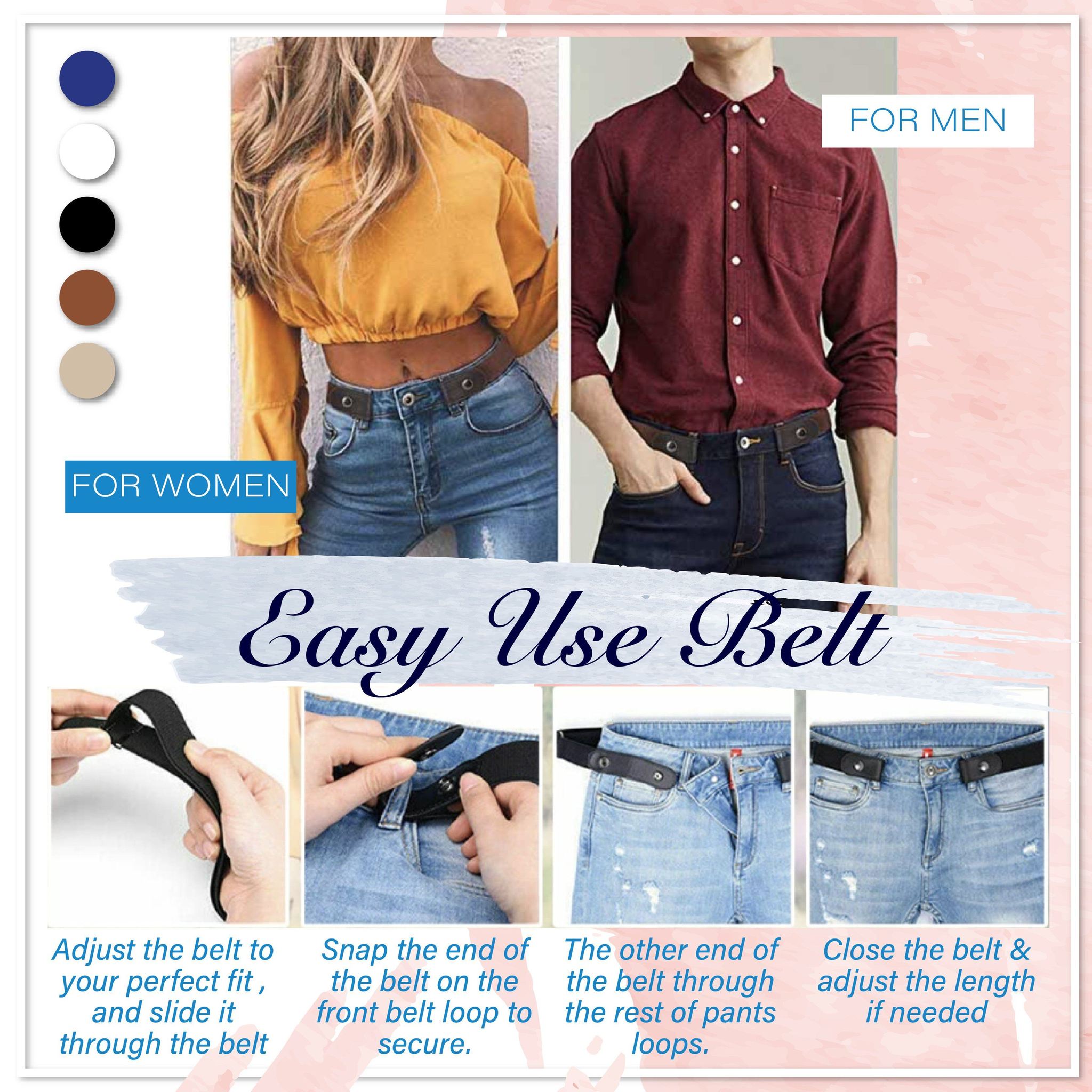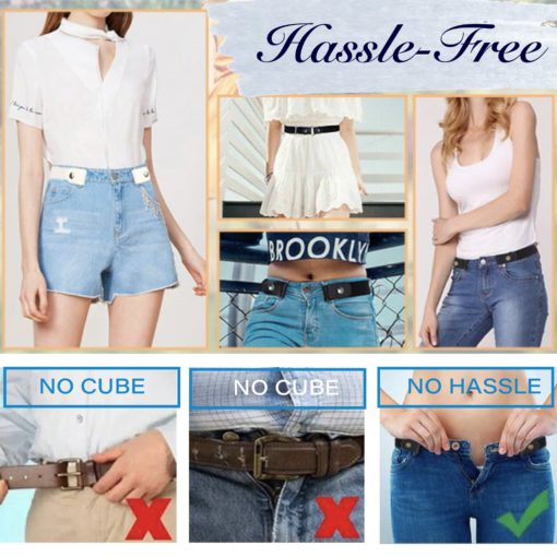 The belt is very comfortable to use because it doesn’t have a buckle pressing into your stomach, no bulge, no need to adjust when you sit down after a meal, and no flaps on the sides. Simply snap it on your jeans and save more time in your busy day. Feel the freedom with the amazing Buckle-free Invisible Elastic Waist Belts! Never fiddle with your buckle again.