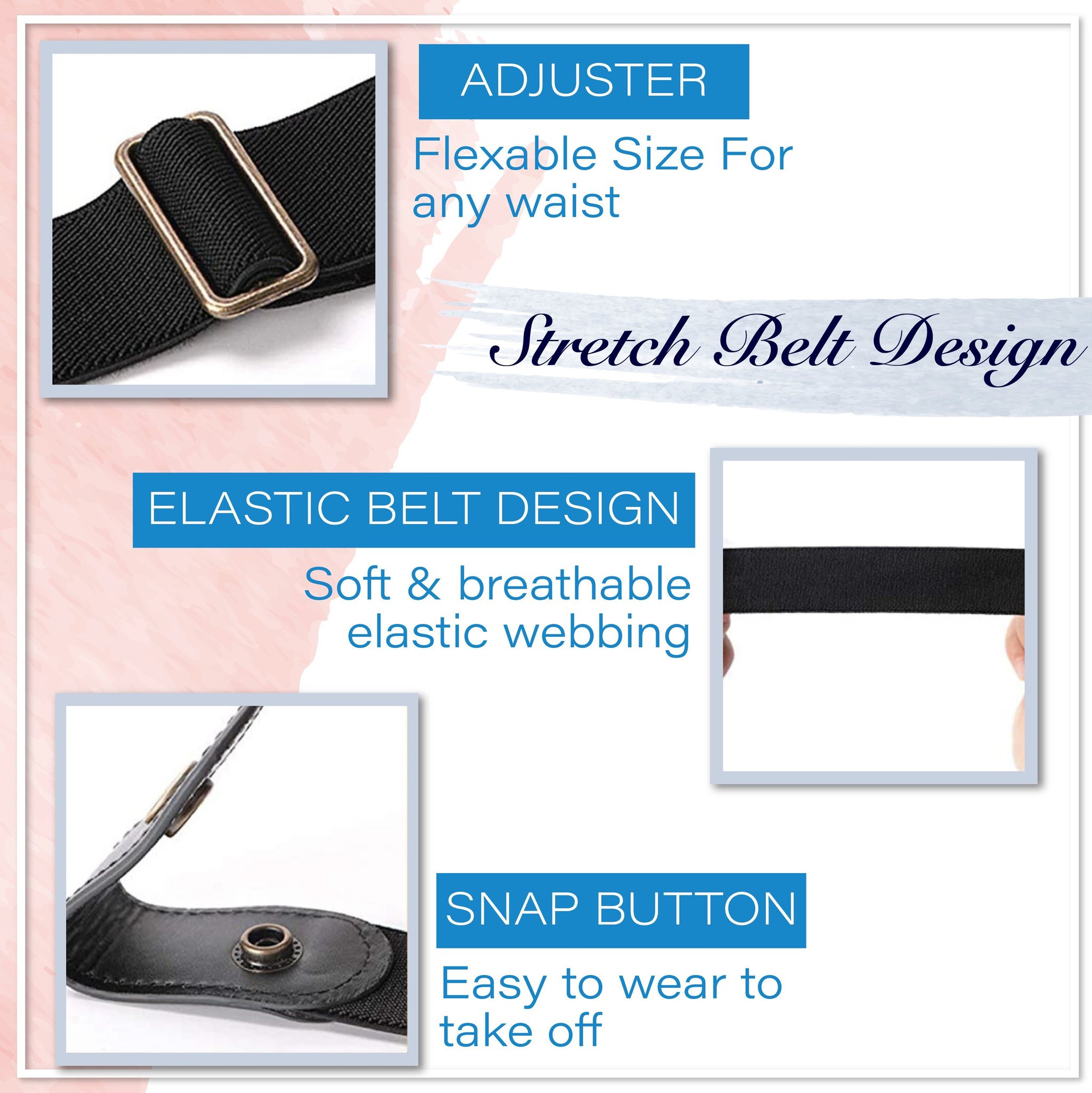 - Materials: Elastic belt strap + high-quality leather + reinforced metal hardware