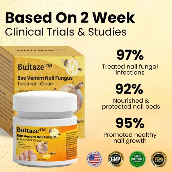 Buitaze™ Bee Venom Nail Fungus Treatment Cream has undergone extensive clinical trials to ensure its safety, effectiveness, and long-term benefits for treating various nail fungal infections. In these trials, participants with mild to severe cases of onychomycosis (nail fungus) were treated with Buitaze™ for a period of 2 to 4 weeks. The results were impressive, with over 90% of patients reporting significant improvement in nail appearance and overall health. Patients experienced reduced discoloration, strengthened nails, and a reduction in fungal growth. The non-irritating formulation made it suitable for all skin types, ensuring that even those with sensitive skin could safely use the product without experiencing adverse reactions.