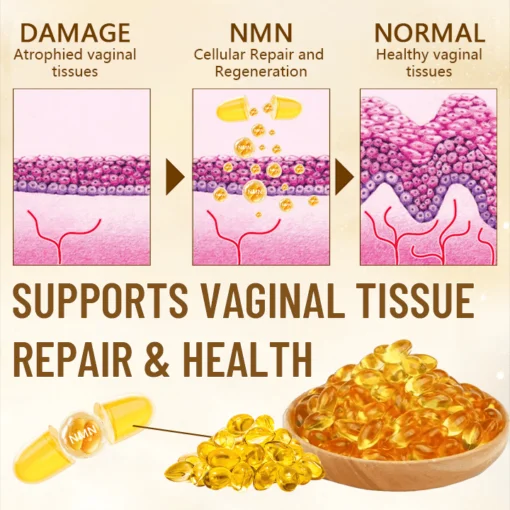 - Enhanced Tissue Health: NMN supports the repair and regeneration of vaginal epithelial cells, improving tissue health and resilience.