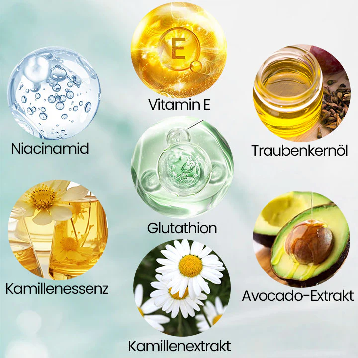 Inhaltsstoffe: Niacinamid, Vitamin E, Sonnenblumenextrakt (Sonnenblumenkernöl), Avocado, Glutathion, Rosenextrakt, Kamille.